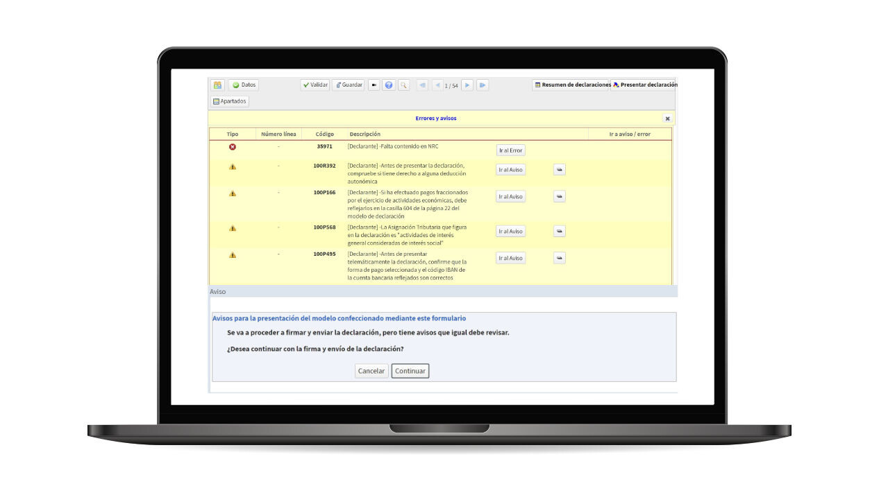 Cuando pulses el botón aceptar, la aplicación avisará sobre posibles errores a corregir antes de presentar la declaración de la renta. Asimismo, mostrará una serie de mensajes de aviso para comprobar que has revisado todos los puntos relevantes antes de continuar.